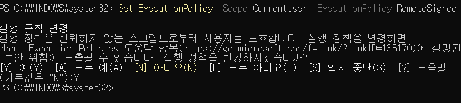 - RemoteSigned : 보안을 유지하면서 NPM 스크립트를 실행할 수 있다.