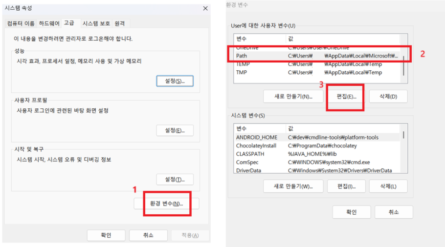 2. ํ๊ฒฝ ๋ณ์ - User์ ๋ํ ์ฌ์ฉ์ ๋ณ์์์ Path์ ํ - ํธ์ง ํด๋ฆญ
