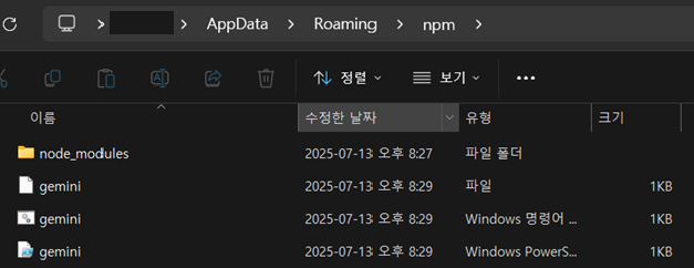 gemini ์คํ ํ์ผ(gemini.cmd)์ด ๋ค์ด ์๋ ์ด ๊ฒฝ๋ก๋ฅผ PATH์์ ์ธ์ํ์ง ๋ชปํด์๋ผ๊ณ ํ๋ค.