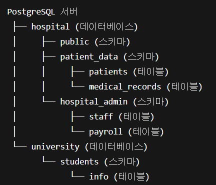 - PostgreSQL ์๋ฒ ์์๋ ์ฌ๋ฌ ๊ฐ์ ๋ฐ์ดํฐ๋ฒ ์ด์ค๋ฅผ ๋ง๋ค ์ ์์