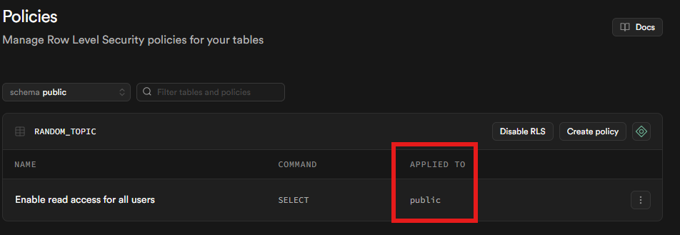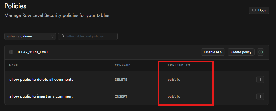 ๐๊ธฐ์ ์ ์ผ๋ก๋ “public ๊ทธ๋ฃน์ SELECT๋ฅผ ํ์ฉํ๋ค”๋ ๋ป์ด์ง๋ง, Supabase ํ๊ฒฝ์์๋ ๋ค์์ฒ๋ผ ์๋ํด: