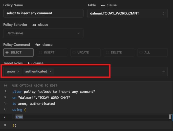 “dalmuri ์คํค๋ง insert/delete๋ anon/authenticated๋ง ๋๊ฒ ํด์ผ ํ์ง ์๋?”