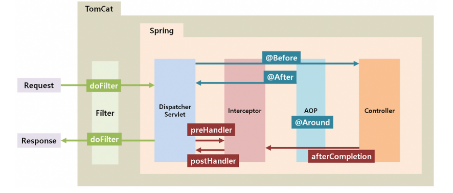 Client → Filter → DispatcherServlet → Interceptor → Controller